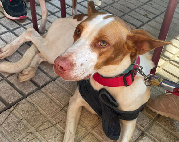 Agatha es una perra grande, de raza Podenca, de pelo corto, marrón y blanco en busca de un nuevo hogar...