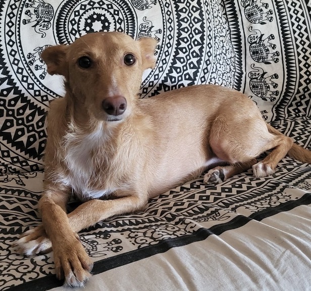 Agatha es una perra grande, de raza Podenca, de pelo corto, marrón y blanco en busca de un nuevo hogar...
