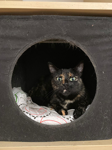 Antonella es una gata muy cariñosa, amante de los masajes meticulosos y con tiempo. Es una gata carey muy divertida, y no le da ningún reparo maullarte en tono ligeramente gruñón si paras de acariciarla demasiado pronto. Ella es una gata que sabe lo que quiere y te lo hará saber.