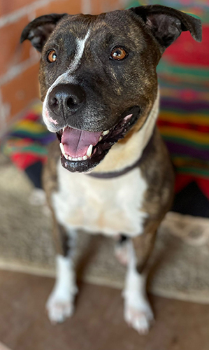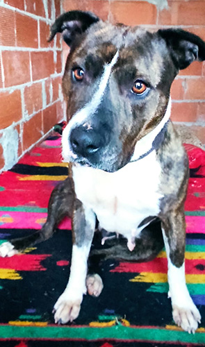 Kanhya es una perrita mestiza, de tamaño mediano y pelo corto, marrón atigrado y blanco, en busca de un nuevo hogar de adopción.