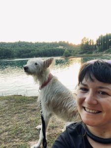 Magda es tranquila y paciente. Se lleva bien con todos los perros y con ellos es diplomática y tolerante: es una perra sabia que ha tenido que sobrevivir sola durante mucho tiempo y evita toda clase de conflicto, pero también de agitación.
