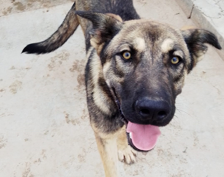 Ónix es un perro cruce de Pastor Alemán, grande, de pelo corto beige y negro, muy cariñoso y juguetón, esperando ser adoptado y encontrar su hogar definitivo.