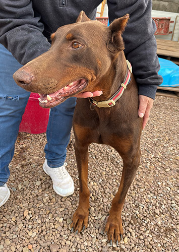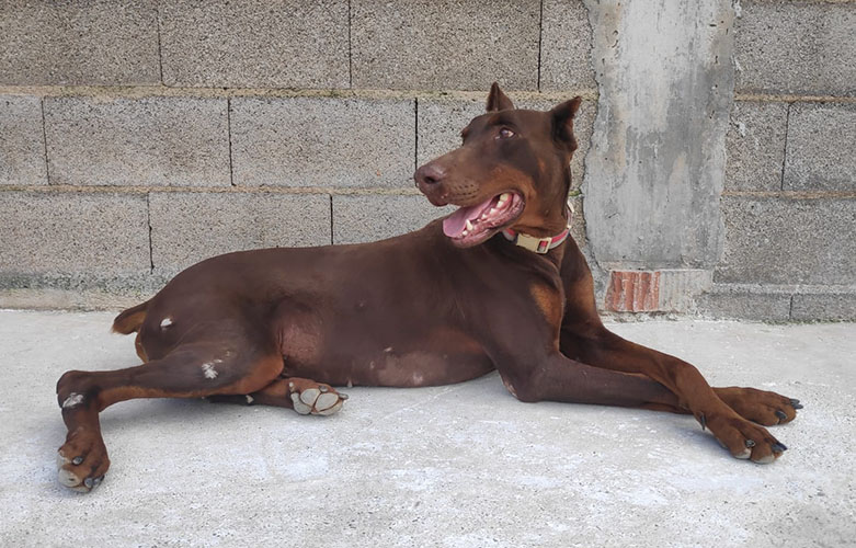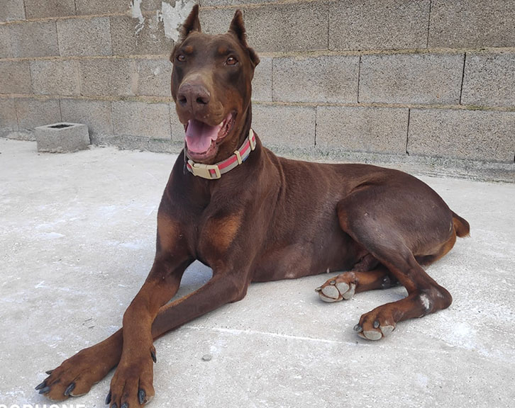 Fue encontrado en Alcora, tenía en el cuello a modo de collar el cinturón de una bata de mujer colgando, estaba bastante delgado, con las orejas y rabo cortados y tenía heridas en codos de estar en una misma posición. Parece ser que se había desatado de donde lo tuvieran e iba por la carretera desorientado. Actualmente busca una nueva familia que le dé el cariño y el trato que realmente merece. Sería perfecta una familia a quién le guste el senderismo, ya que es una actividad que Dober disfruta mucho.