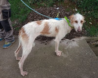 Es una hembra podenca joven de tamaño grande y 23 kgs. Es de color blanco con manchas marrones y de aspecto sucia y delgada. La hemos llamado Maya.