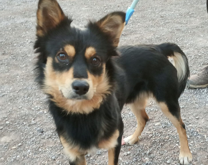 Macho, 1 año aprox., tamaño PEQUEÑO-MEDIANO, 10-12 kg, MESTIZO, NEGRO/FUEGO, pelo SEMILARGO.