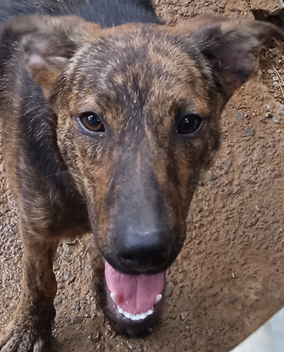 Abril es una cachorrita mestiza que está creciendo junto con sus hermanos en la asociación y necesita un hogar de adopción. Es una perrita tímida, de tamaño mediano y pelo corto atigrado.