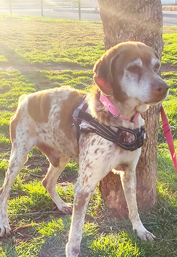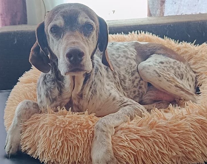 Martín es un perro mayor, tranquilo y dormilón, de tamaño mediano, mestizo de pelo corto blanco y marrón, en busca de un nuevo hogar.