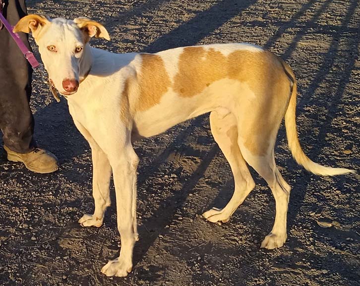 Macho, JOVEN, tamaño GRANDE, 25 kg, PODENCO, BLANCO Y CANELA, pelo CORTO.