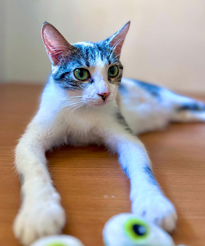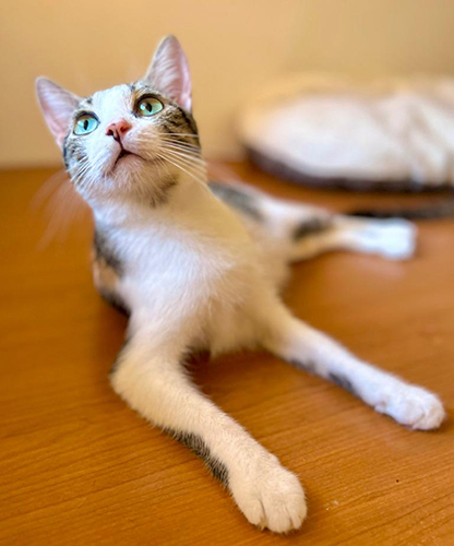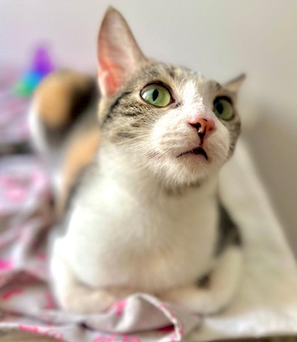 Poliana es una gatita muy bonita, blanca, gris y naranja, muy buena, en busca de una nueva familia.
