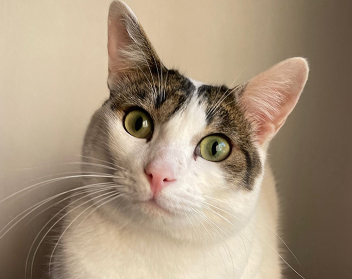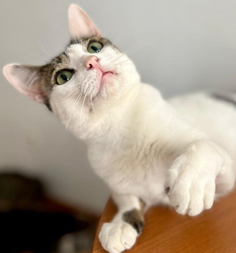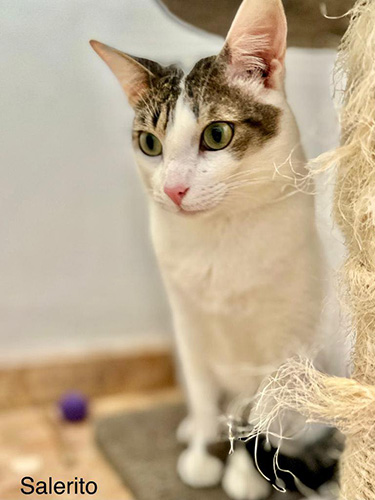 Salero es un gato blanco con manchas, curioso y juguetón en busca de ser adoptado y encontrar un hogar definitivo.