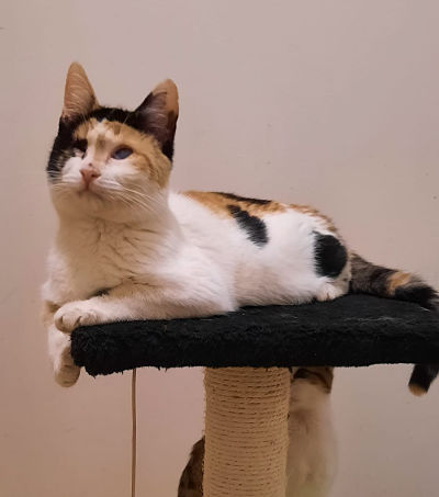 Tecla es una preciosa gata tricolor que está buscando un hogar. Fue rescatada por los bomberos del patio interior de una finca. Al parecer se cayó por la ventana, por suerte no le pasó nada. Las personas que la tenían la cedieron a la protectora y desde entonces ella vive en la protectora junto a más gatos.