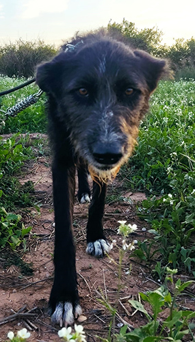 Apareció en las puertas de nuestro terreno, no sabemos si fue la casualidad o la dejaron allí para que la recogiésemos. Al principio cojeaba un poco, se le hizo placas, y se le dio un tratamiento, que le ha ido muy bien y ya no cojea.
