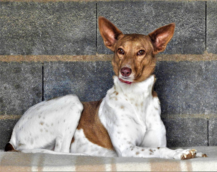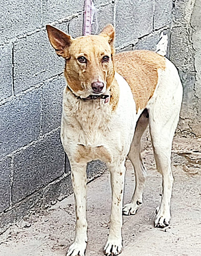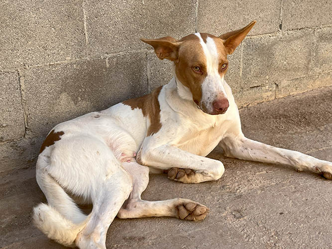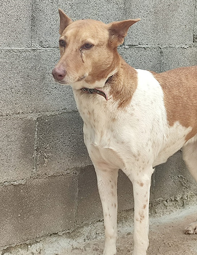 Agatha es una perra grande, de raza Podenca, de pelo corto, marrón y blanco en busca de un nuevo hogar...