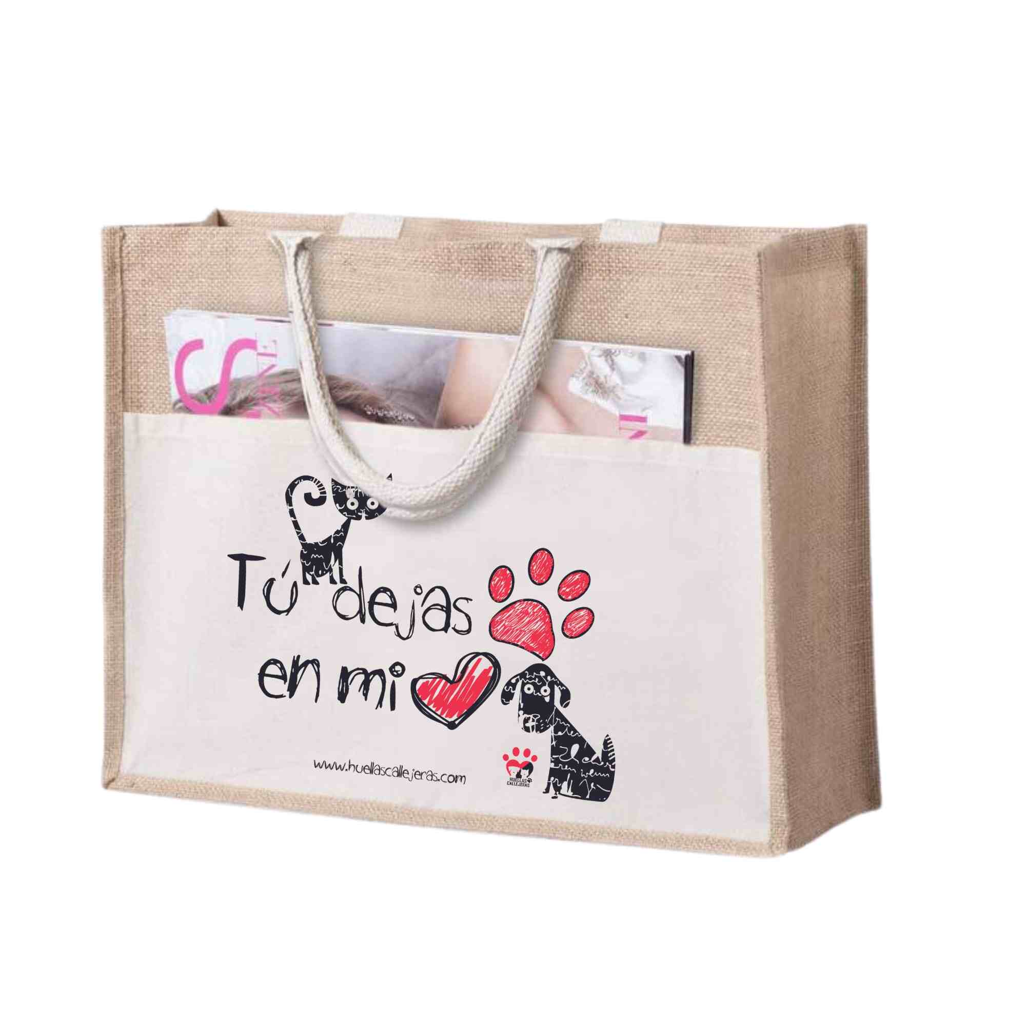 Bolsa de tela de color blanco y con el bonito lema: «Tú dejas huella en mi corazón». Esta dispone de asas, está fabricada en material de loneta y algodón, y es de tamaño grande.
