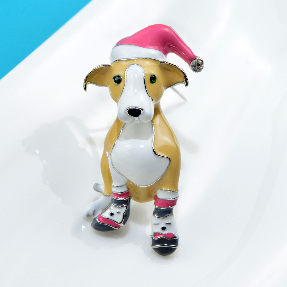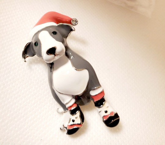 Divertido broche navideño de perrito con calcetines y gorrito de navidad, ideal darle un toque navideño a cualquier prenda. Si te gustan la navidad y los perritos este es tu broche.