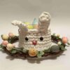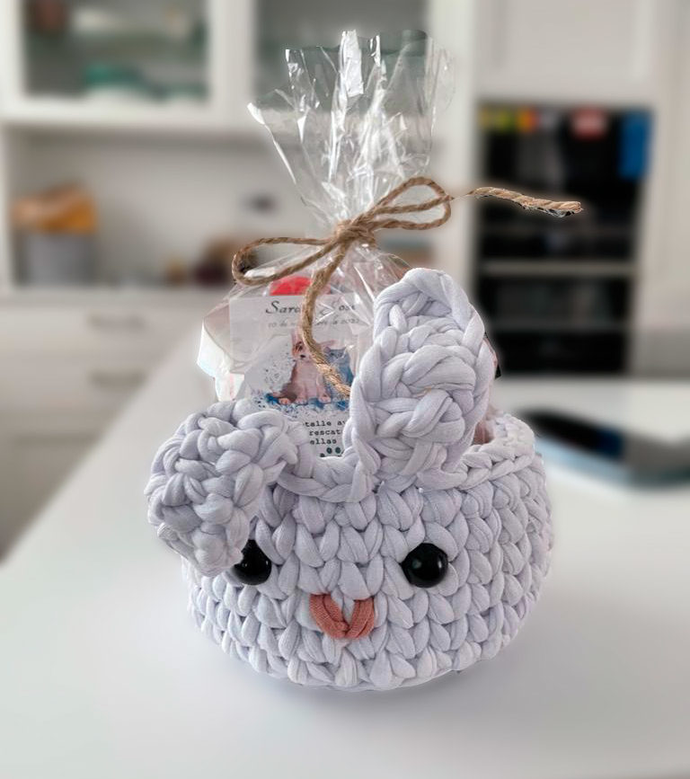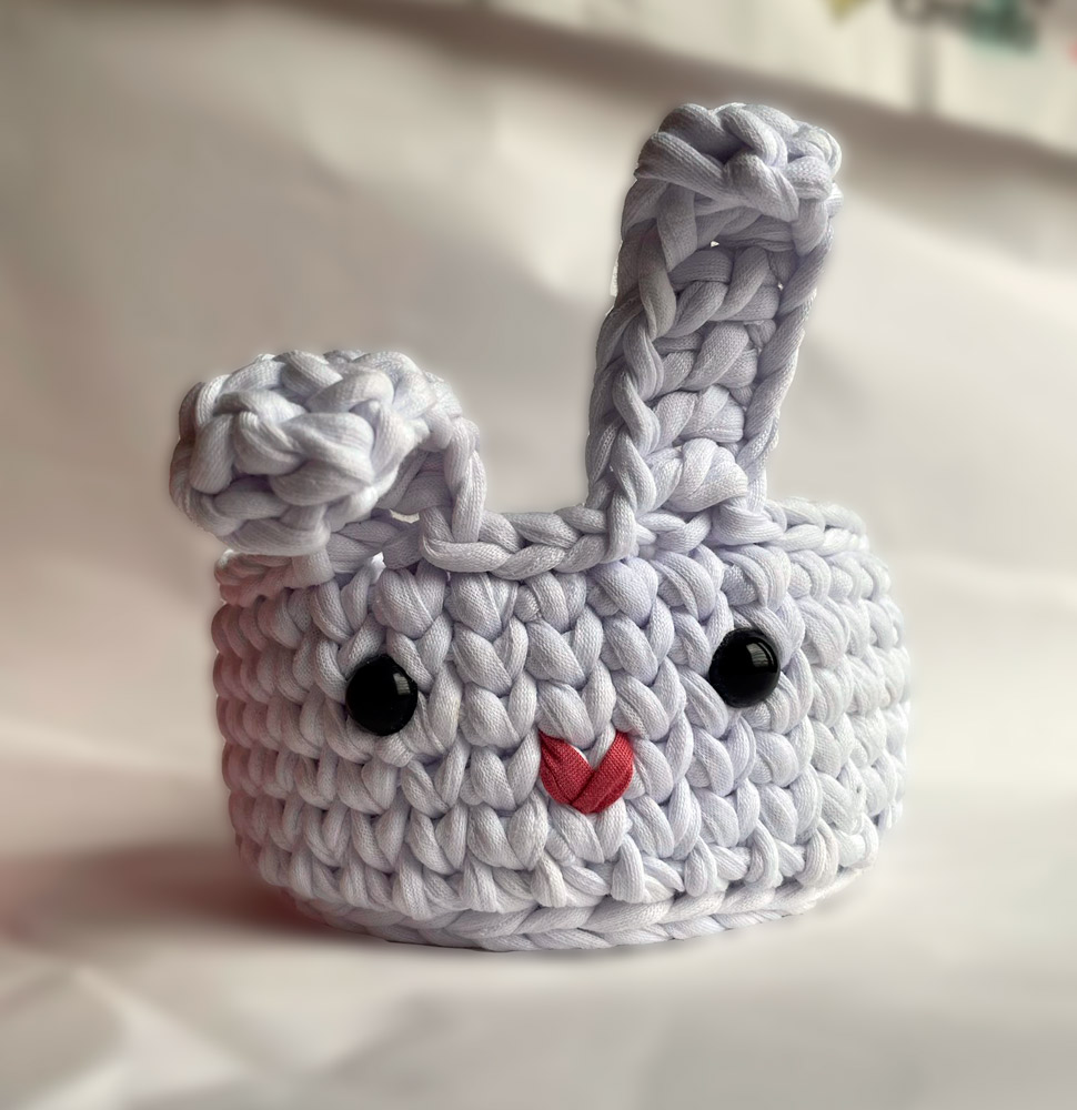 Cesta tejida a mano con trapillo en forma de un divertido conejito. Son perfectas para guardar pequeñas cosas como dulces, joyas, cosméticos, etc. Elige el color que más te guste: