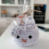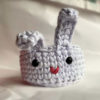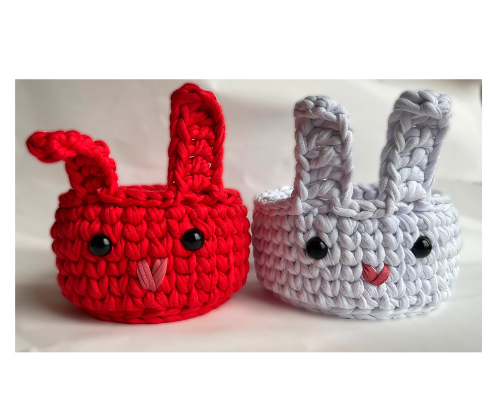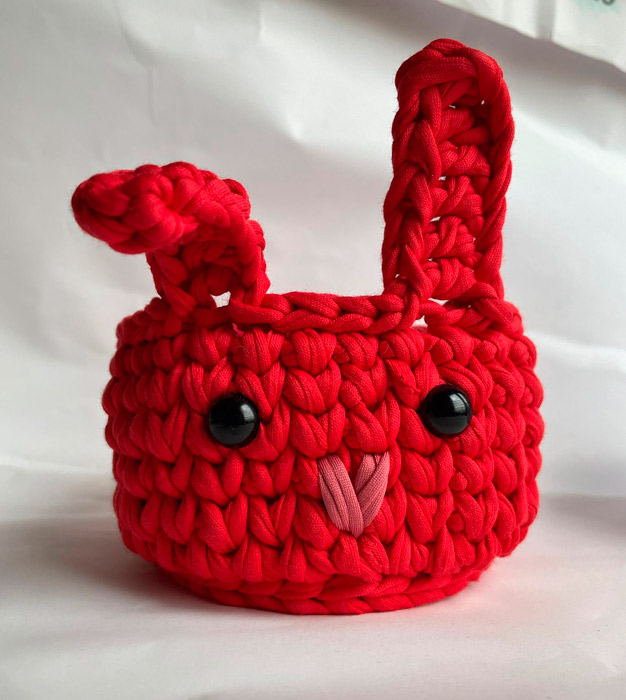 Cesta tejida a mano con trapillo en forma de un divertido conejito. Son perfectas para guardar pequeñas cosas como dulces, joyas, cosméticos, llaves, como protector de macetas pequeñas, etc. Complementarán perfectamente el dormitorio, baño, cocina o salón y la verdad es que quedan monísimas.