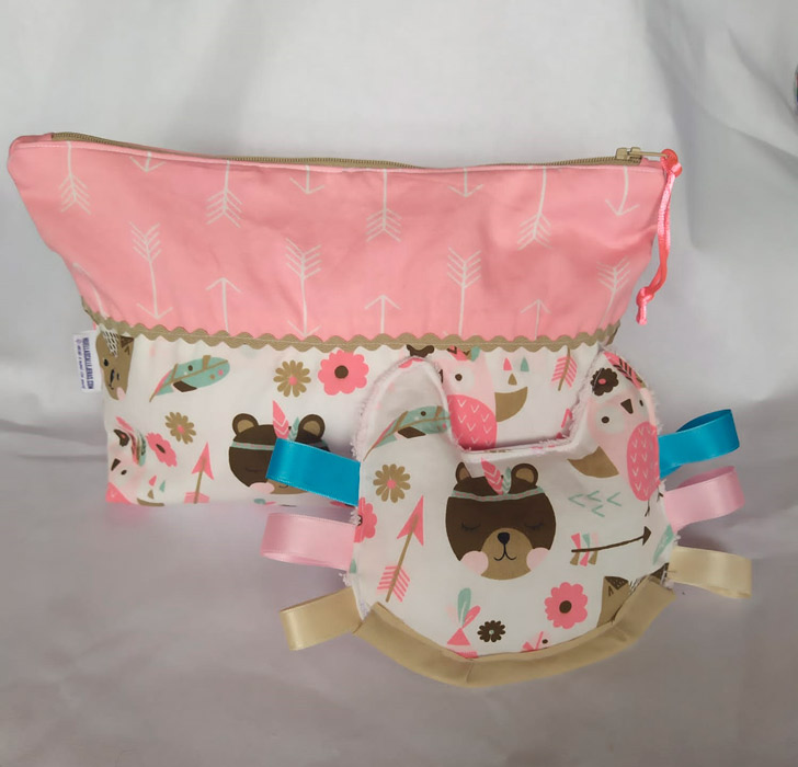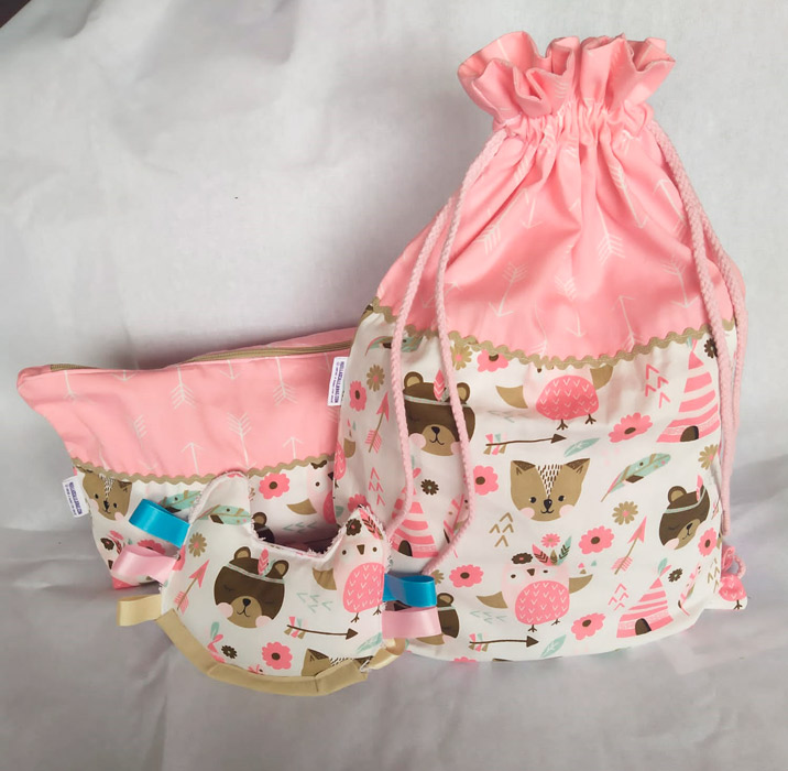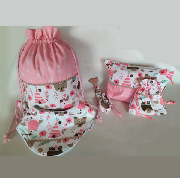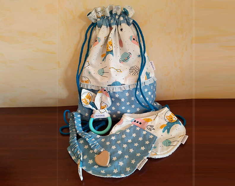 – Compuesto por: una bolsita guarda chupetes, babero bandana, cuelga chupetero, mordedor de tela, neceser, mochila y juguete.