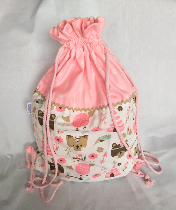 – La mochila es de tela de algodón, forrada en su interior y con cierre de cordón ajustable. Medidas aproximadas: 30cm x 40cm.