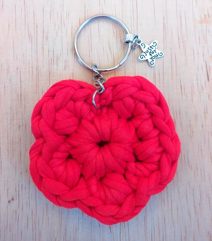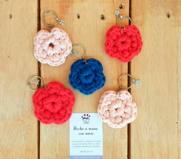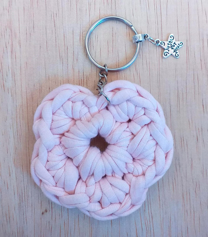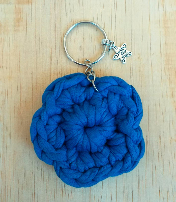 Llavero tejido a mano con trapillo en forma de flor. Hecho con mucho cuidado y mimo. Perfecto para hacer un regalo divertido y creativo o bien para poner en tus llaves o mochila y diferenciarlas del resto.