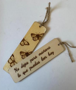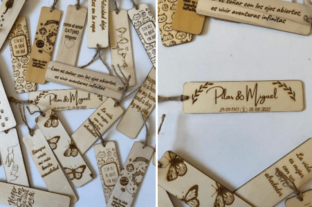 Con el grabado y diseño que nos digas, totalmente personalizadas, aunque tenemos diseños estándar que, seguro que te gustarán, van grabados por ambas caras y son de madera.