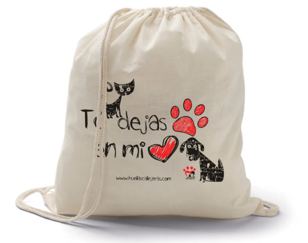 La mochila de tela con frase «Tú dejas huella en mi corazón» es la alternativa a las famosas tote bags pero en versión mochila de cuerdas tipo saco para transportarla más cómodamente en la espalda. Está disponible solamente en color beige ya que se fabrica con algodón 100%. Además es muy ligera (gramaje: 100 g/m2). Es un obsequio que funciona muy bien para todas las ocasiones, es un artículo útil de uso casi diario y además es solidario.