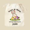 Saquito en color claro y personalizado para recolectar los huevos de pascuas escondidos.