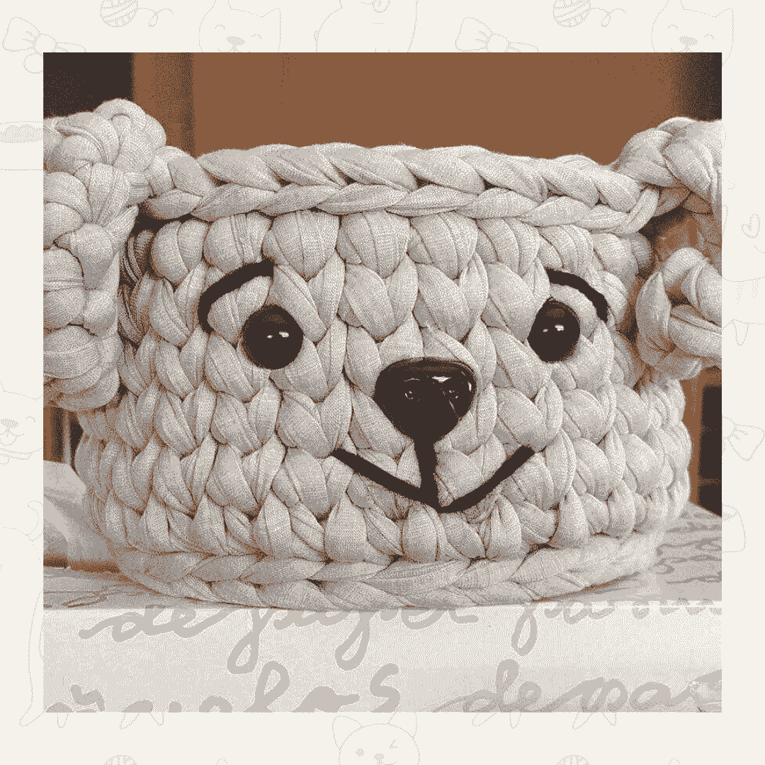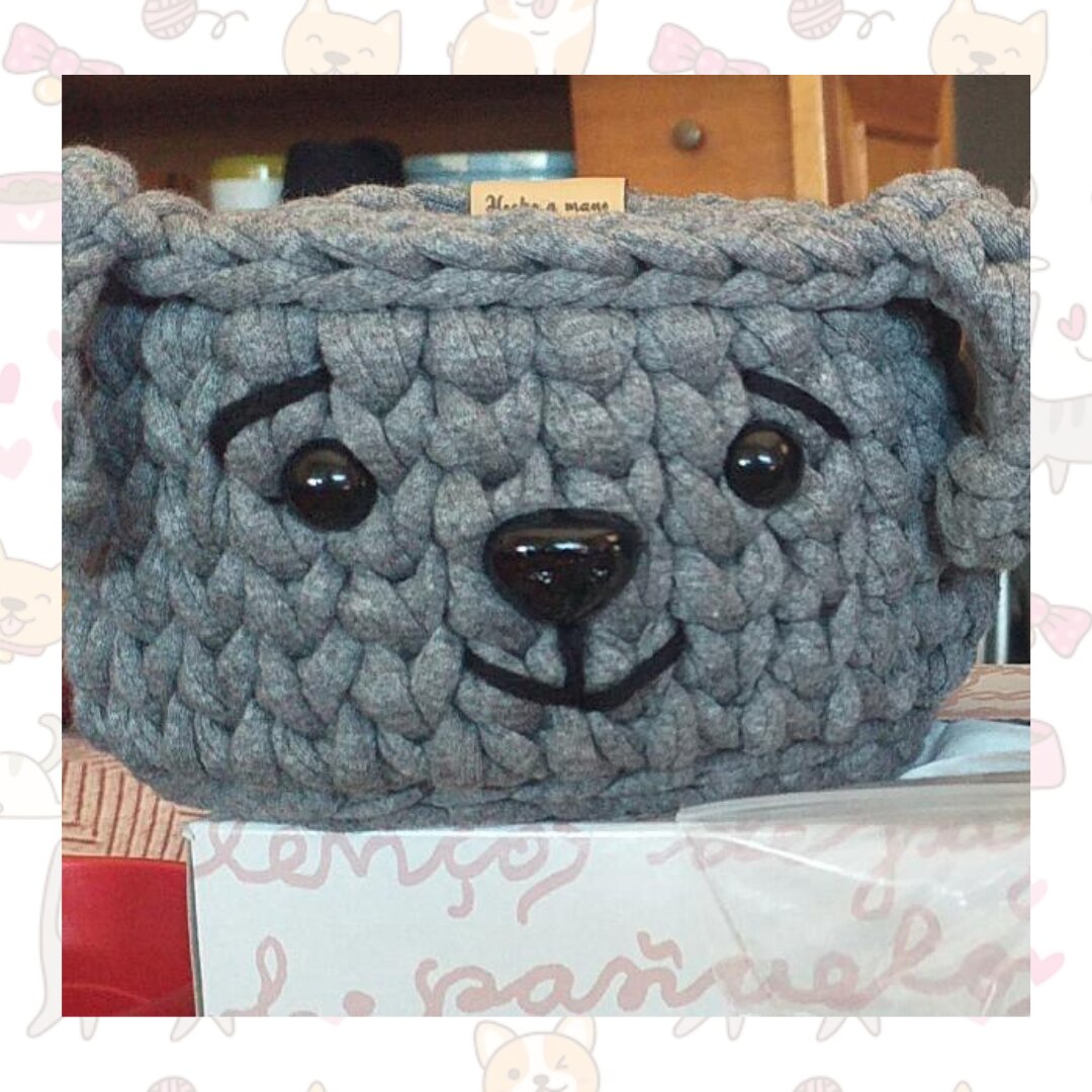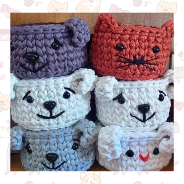 Cesta tejida a mano con trapillo en forma de un divertido perrito. Son perfectas para guardar pequeñas cosas como dulces, joyas, cosméticos, llaves, etc. Complementarán perfectamente el dormitorio, baño, cocina, hall o salón y, además, quedan monísimas.