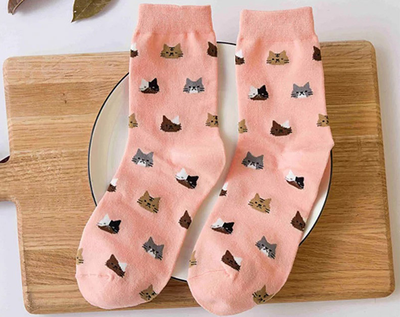 Calcetines medio altos con caritas de gatitos. Son muy suaves, calentitos e ideales para épocas de otoño e invierno, además es un regalo ideal para esa persona especial.