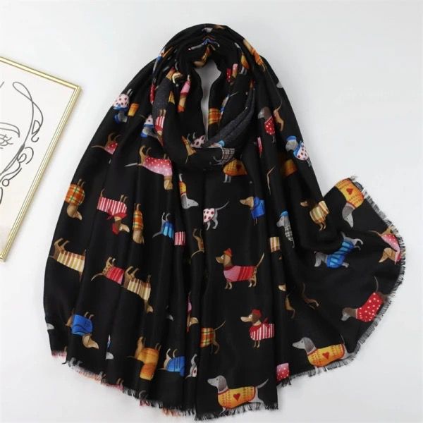Bufanda ligera de material de algodón y viscosa, con flecos y estampado muy divertido en el que se pueden ver a diferentes perros salchicha con colores vivos y alegres. Es un producto muy suave al tacto, lo que lo convertirá en tu complemento preferido. Además, puedes escoger entre dos diseños: negro y beige.